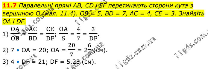 11.7 Паралельні прямі AB, CD і EF перетинають сторони кута з вершиною O (мал. 11.4). OB = 5, BD = 7, AC = 4, CE = 3. Знайдіть OA і DF. 1) OA/OB = AC/BD = CE/DF; OA/5 = 4/7 = 3/DF. 2) 7 • OA = 20; OA = 20/7 = 26/7 (см). 3) 4 • DF = 21; DF = 5,25 (см).