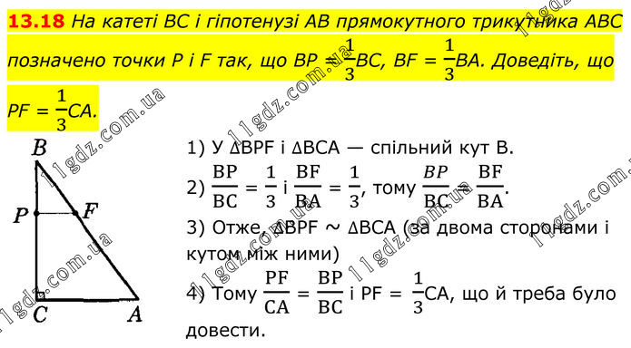 На катеті BC і гіпотенузі AB прямокутного трикутника ABC позначено точки P і F так, що BP = 1/3BC, BF = 1/3ВА. Доведіть, що PF = 1/3CA. 1) У ∆BPF і ∆BCA — спільний кут В. 2) BP/BC = 1/3 і BF/BA = 1/3, тому BP/BC = BF/BA. 3) Отже, ∆BPF ~ ∆BCA (за двома сторонами і кутом між ними) 4) Тому PF/CA = BP/BC i PF = 1/3CA, що й треба було довести.
