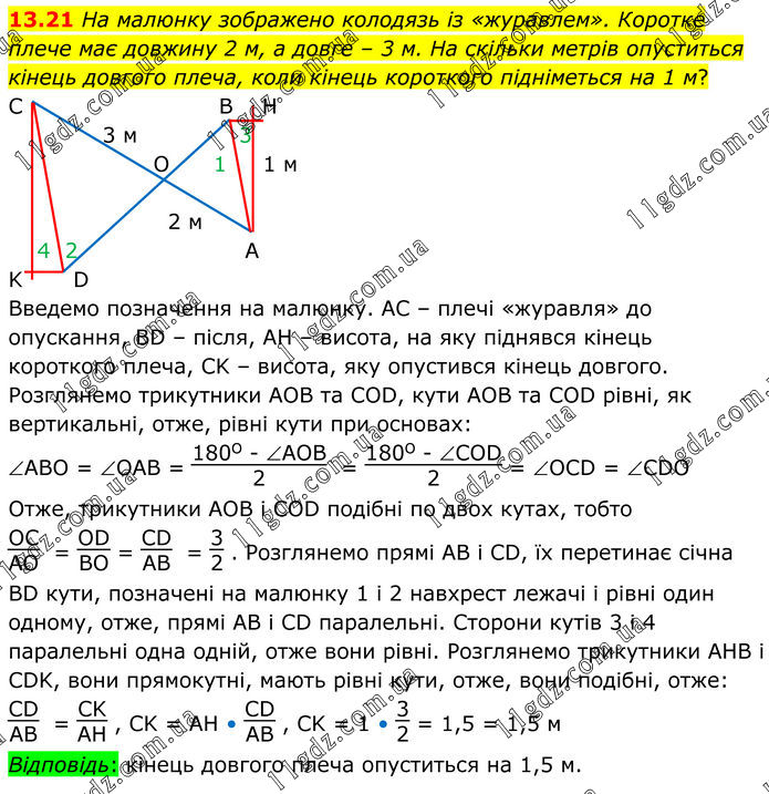 На малюнку зображено колодязь із «журавлем». Коротке плече має довжину 2 м, а довге – 3 м. На скільки метрів опуститься кінець довгого плеча, коли кінець короткого підніметься на 1 м? Введемо позначення на малюнку. AC – плечі «журавля» до опускання, BD – після, AH – висота, на яку піднявся кінець короткого плеча, CK – висота, яку опустився кінець довгого. Розглянемо трикутники AOB та COD, кути AOB та COD рівні, як вертикальні, отже, рівні кути при основах: ∠ABO = ∠OAB = (180°-∠АОВ)/2 = (180°-∠COD)/2 = ∠OCD = ∠CDO Отже, трикутники AOB і COD подібні по двох кутах, тобто OC/AO = OD/BO= CD/AB = 3/2. Розглянемо прямі AB і CD, їх перетинає січна BD кути, позначені на малюнку 1 і 2 навхрест лежачі і рівні один одному, отже, прямі AB і CD паралельні. Сторони кутів 3 і 4 паралельні одна одній, отже вони рівні. Розглянемо трикутники AHB і CDK, вони прямокутні, мають рівні кути, отже, вони подібні, отже: CD/AB = CK/AH, CK = AH • CD/AB, CK = 1 • 32 = 1,5 = 1,5 м Відповідь: кінець довгого плеча опуститься на 1,5 м.
