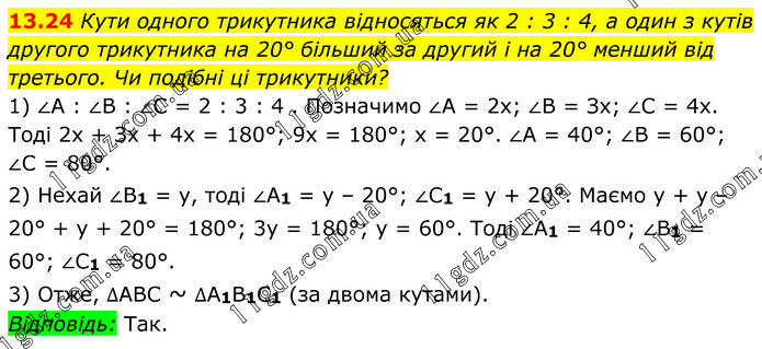 Кути одного трикутника відносяться як 2 : 3 : 4, а один з кутів другого трикутника на 20° більший за другий і на 20° менший від третього. Чи подібні ці трикутники? 1) ∠A : ∠B : ∠C = 2 : 3 : 4 . Позначимо ∠A = 2х; ∠B = Зх; ∠C = 4х. Тоді 2х + Зх + 4х = 180°; 9х = 180°; x = 20°. ∠A = 40°; ∠B = 60°; ∠C = 80°. 2) Нехай ∠B1 = у, тоді ∠A1 = у – 20°; ∠C1 = у + 20°. Маємо у + у – 20° + у + 20° = 180°; 3у = 180°; у = 60°. Тоді ∠A1 = 40°; ∠B1 = 60°; ∠C1 = 80°. 3) Отже, ∆ABC ~ ∆A1B1C1 (за двома кутами). Відповідь: Так.