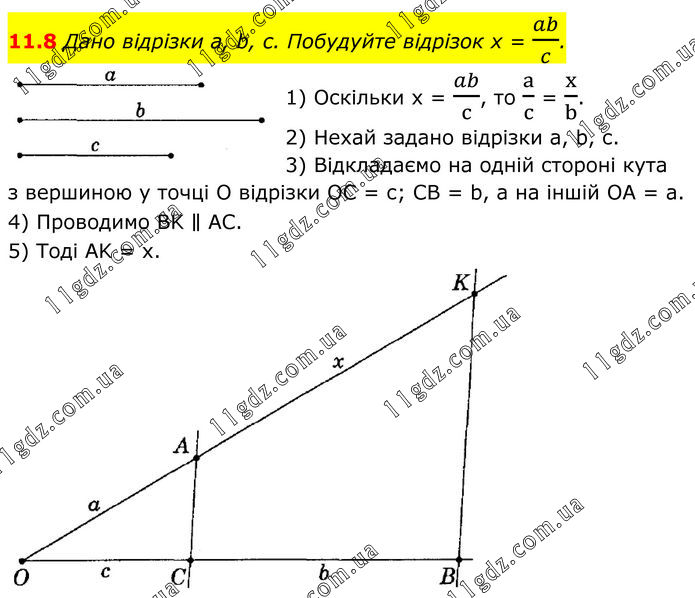 11.8 Дано відрізки a, b, c. Побудуйте відрізок х = ab/c. 1) Оскільки х = ab/c, то a/c = x/b. 2) Нехай задано відрізки а, b, с. 3) Відкладаємо на одній стороні кута з вершиною у точці O відрізки OC = с; CB = b, а на іншій OA = а. 4) Проводимо BK ∥ AC. 5) Тоді AK = х.
