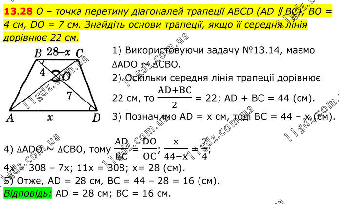 O – точка перетину діагоналей трапеції ABCD (AD ∥ BC), BO = 4 см, DO = 7 см. Знайдіть основи трапеції, якщо її середня лінія дорівнює 22 см. 1) Використовуючи задачу №13.14, маємо ∆ADO ~ ∆СВО. 2) Оскільки середня лінія трапеції дорівнює 22 см, то (AD+BC)/2 = 22; AD + BC = 44 (см). 3) Позначимо AD = х см, тоді BC = 44 – х (см). 4) ∆ADO ~ ∆CBO, тому AD/BC = DO/OC; x/(44-x) = 7/4; 4x = 308 – 7x; 11x = 308; х= 28 (см). 5) Отже, AD = 28 см, BC = 44 – 28 = 16 (см). Відповідь: AD = 28 см; BC = 16 см.
