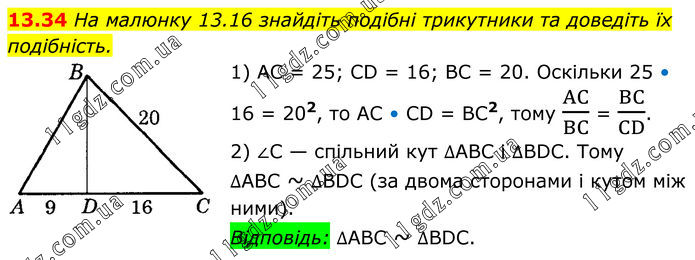 На малюнку 13.16 знайдіть подібні трикутники та доведіть їх подібність. 1) AC = 25; CD = 16; BC = 20. Оскільки 25 • 16 = 202, то AC • CD = BC2, тому AC/BC = BC/CD. 2) ∠C — спільний кут ∆ABC і ∆BDC. Тому ∆ABC ~ ∆BDC (за двома сторонами і кутом між ними). Відповідь: ∆ABC ~ ∆BDC.