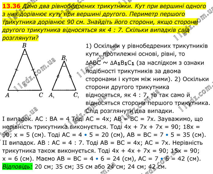 Дано два рівнобедрених трикутники. Кут при вершині одного з них дорівнює куту при вершині другого. Периметр першого трикутника дорівнює 90 см. Знайдіть його сторони, якщо сторони другого трикутника відносяться як 4 : 7. Скільки випадків слід розглянути? 1) Оскільки у рівнобедрених трикутників кути, протилежні основі, рівні, то ∆ABC ~ ∆A1B1C1 (за наслідком з ознаки подібності трикутників за двома сторонами і кутом між ними). 2) Оскільки сторони другого трикутника відносяться, як 4 : 7, то так само й відносяться сторони першого трикутника. Слід розглянути два випадки. I випадок. AC : BA = 4 Тоді AC = 4х; AB = BC = 7х. Зауважимо, що нерівність трикутника виконується. Тоді 4х + 7x + 7х = 90; 18х = 90; х = 5 (см). Тоді AC = 4 • 5 = 20 (см), AB = BC = 7 • 5 = 35 (см). II випадок. AB : AC = 4 : 7. Тоді AB = BC = 4х; AC = 7х. Нерівність трикутника також виконується. Тоді 4х + 4х + 7x = 90; 15x = 90; х = 6 (см). Маємо AB = BC = 4 • 6 = 24 (см), AC = 7 • 6 = 42 (см). Відповідь: 20 см; 35 см; 35 см або 24 см; 24 см; 42 см.