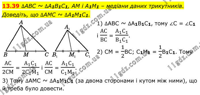 ∆ABC ~ ∆A1B1C1, AM і A1M1 – медіани даних трикутників. Доведіть, що ∆AMC ~ ∆A1M1C1. 1) ∆ABC ~ ∆A1B1C1, тому ∠C = ∠C1 і АС/ВС = (А_1 С_1)/(В_1 С_1 ). 2) СМ = 1/2ВС; С1М1 = 1/2В1С1. Тому АС/2СМ = (А_1 С_1)/(2С_1 М_1 ) і АС/СМ = (А_1 С_1)/(С_1 М_1 ). 3) Тому ∆AMC ~ ∆A1M1C1 (за двома сторонами і кутом між ними), що й треба було довести.