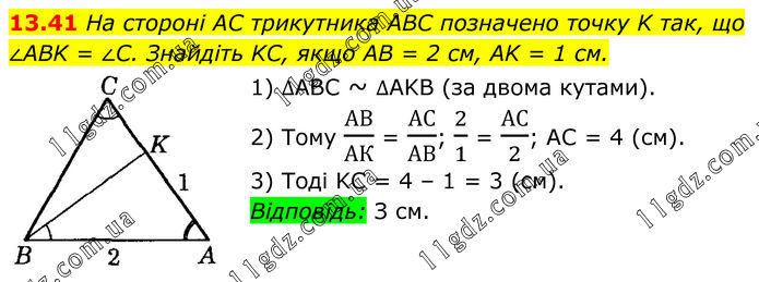 На стороні AC трикутника ABC позначено точку K так, що ∠ABK = ∠C. Знайдіть KC, якщо AB = 2 см, AK = 1 см. 1) ∆ABC ~ ∆AKB (за двома кутами). 2) Тому АВ/АК = АС/АВ; 2/1 = АС/2; AC = 4 (см). 3) Тоді KC = 4 – 1 = 3 (см). Відповідь: З см.