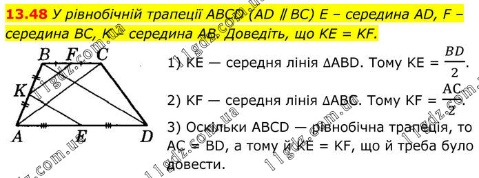 У рівнобічній трапеції ABCD (AD ∥ BC) E – середина AD, F – середина BC, K – середина AB. Доведіть, що KE = KF. 1) KE — середня лінія ∆ABD. Тому KE = BD/2. 2) KF — середня лінія ∆ABC. Тому KF = AC/2. 3) Оскільки ABCD — рівнобічна трапеція, то AC = BD, а тому й KE = KF, що й треба було довести.