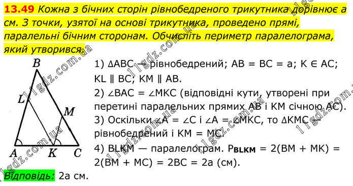 Кожна з бічних сторін рівнобедреного трикутника дорівнює а см. З точки, узятої на основі трикутника, проведено прямі, паралельні бічним сторонам. Обчисліть периметр паралелограма, який утворився. 1) ∆ABC — рівнобедрений; AB = BC = a; K ∈ AC; KL ∥ BC; KM ∥ AB. 2) ∠BAC = ∠MKC (відповідні кути, утворені при перетині паралельних прямих AB і KM січною AC). 3) Оскільки ∠A = ∠C і ∠A = ∠MKC, то ∆KMC — рівнобедрений і KM = MC. 4) BLKM — паралелограм. PBLKM = 2(BM + MK) = 2(BM + MC) = 2BC = 2а (см). Відповідь: 2а см.