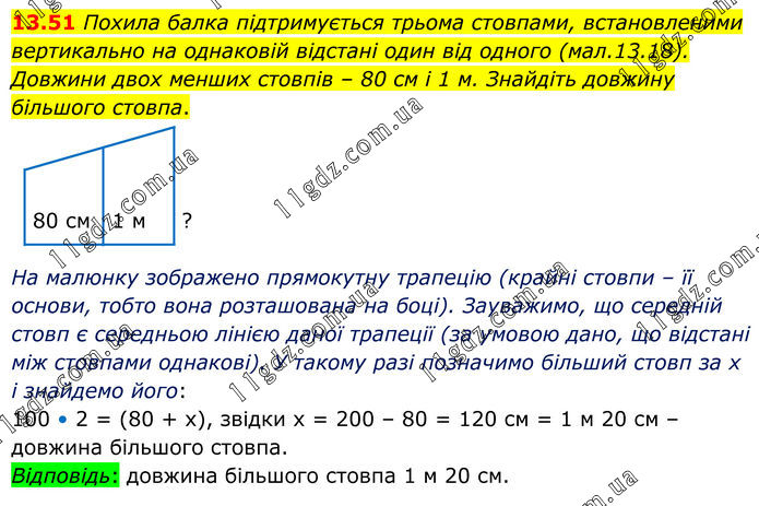 Похила балка підтримується трьома стовпами, встановленими вертикально на однаковій відстані один від одного (мал.13.18). Довжини двох менших стовпів – 80 см і 1 м. Знайдіть довжину більшого стовпа. На малюнку зображено прямокутну трапецію (крайні стовпи – її основи, тобто вона розташована на боці). Зауважимо, що середній стовп є середньою лінією даної трапеції (за умовою дано, що відстані між стовпами однакові). У такому разі позначимо більший стовп за x і знайдемо його: 100 • 2 = (80 + x), звідки x = 200 – 80 = 120 см = 1 м 20 см – довжина більшого стовпа. Відповідь: довжина більшого стовпа 1 м 20 см.