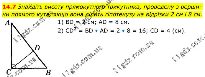 Знайдіть висоту прямокутного трикутника, проведену з верши–ни прямого кута, якщо вона ділить гіпотенузу на відрізки 2 см і 8 см. 1) BD = 2 см; AD = 8 см. 2) CD2 = BD • AD = 2 • 8 = 16; CD = 4 (см).
