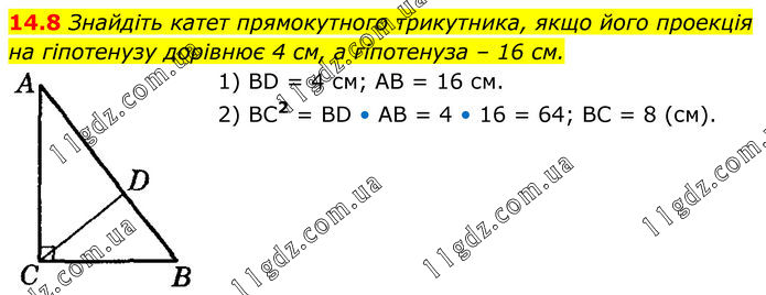 Знайдіть катет прямокутного трикутника, якщо його проекція на гіпотенузу дорівнює 4 см, а гіпотенуза – 16 см. 1) BD = 4 см; AB = 16 см. 2) BC2 = BD • AB = 4 • 16 = 64; BC = 8 (см).