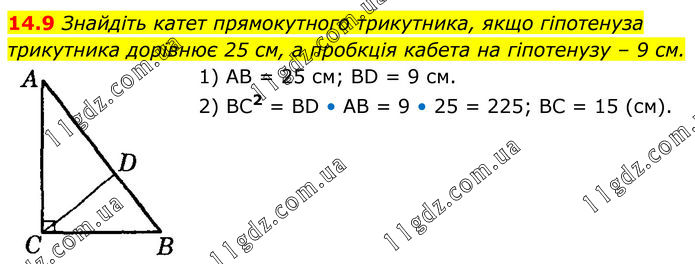 Знайдіть катет прямокутного трикутника, якщо гіпотенуза трикутника дорівнює 25 см, а пробкція кабета на гіпотенузу – 9 см. 1) AB = 25 см; BD = 9 см. 2) BC2 = BD • AB = 9 • 25 = 225; BC = 15 (см).