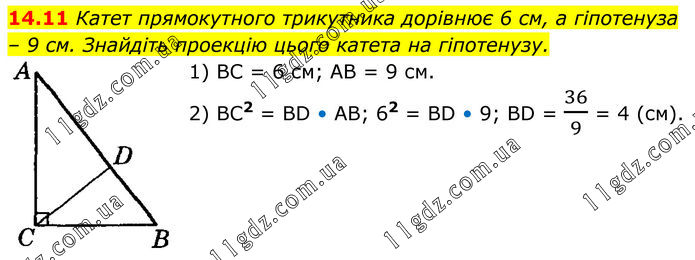 Катет прямокутного трикутника дорівнює 6 см, а гіпотенуза – 9 см. Знайдіть проекцію цього катета на гіпотенузу. 1) BC = 6 см; AB = 9 см. 2) BC2 = BD • AB; 62 = BD • 9; BD = 36/9 = 4 (см).