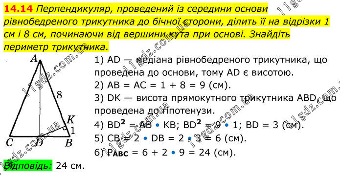 Перпендикуляр, проведений із середини основи рівнобедреного трикутника до бічної сторони, ділить її на відрізки 1 см і 8 см, починаючи від вершини кута при основі. Знайдіть периметр трикутника. 1) AD — медіана рівнобедреного трикутника, що проведена до основи, тому AD є висотою. 2) AB = AC = 1 + 8 = 9 (см). 3) DK — висота прямокутного трикутника ABD, що проведена до гіпотенузи. 4) BD2 = AB • KB; BD2 = 9 • 1; BD = 3 (см). 5) CB = 2 • DB = 2 • 3 = 6 (см). 6) РАВС = 6 + 2 • 9 = 24 (см). Відповідь: 24 см.