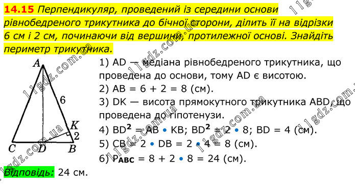 Перпендикуляр, проведений із середини основи рівнобедреного трикутника до бічної сторони, ділить її на відрізки 6 см і 2 см, починаючи від вершини, протилежної основі. Знайдіть периметр трикутника. 1) AD — медіана рівнобедреного трикутника, що проведена до основи, тому AD є висотою. 2) AB = 6 + 2 = 8 (см). 3) DK — висота прямокутного трикутника ABD, що проведена до гіпотенузи. 4) BD2 = AB • KB; BD2 = 2 • 8; BD = 4 (см). 5) CB = 2 • DB = 2 • 4 = 8 (см). 6) РАВС = 8 + 2 • 8 = 24 (см). Відповідь: 24 см.