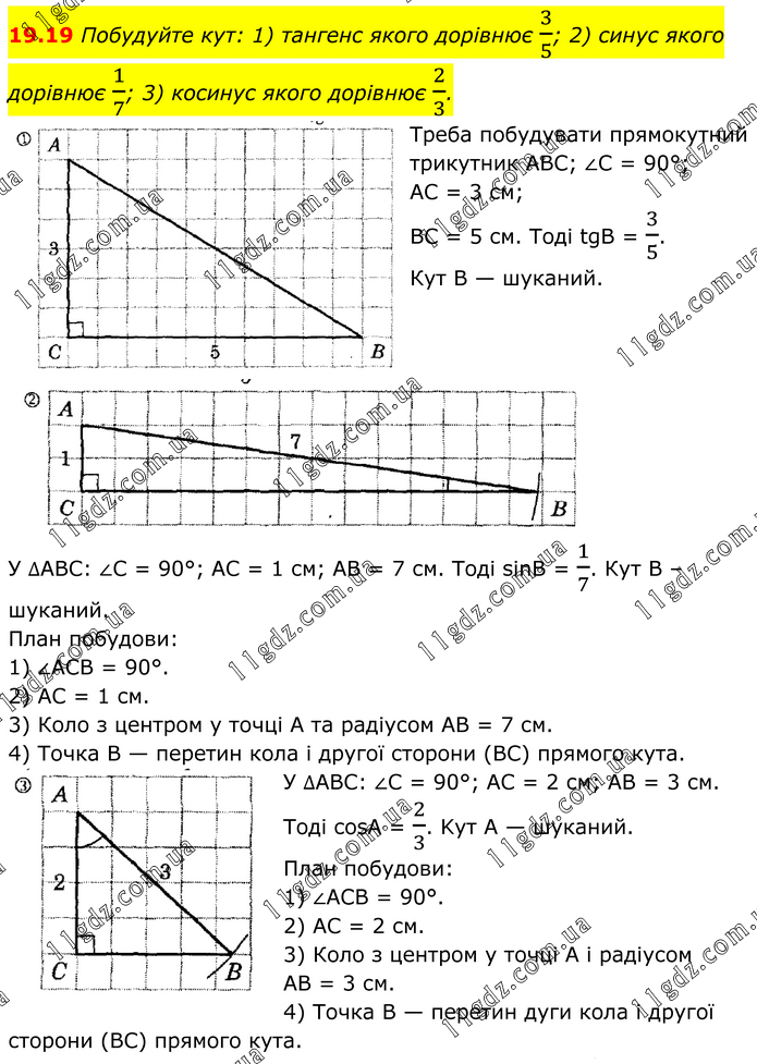 Побудуйте кут: 1) тангенс якого дорівнює 3/5; 2) синус якого дорівнює 1/7; 3) косинус якого дорівнює 2/3. Треба побудувати прямокутний трикутник ABC; ∠C = 90°; AC = 3 см; BC = 5 см. Тоді tgB = 3/5. Кут В — шуканий. У ∆АВС: ∠C = 90°; AC = 1 см; AB = 7 см. Тоді sinB = 1/7. Кут B – шуканий. План побудови: 1) ∠ACB = 90°. 2) AC = 1 см. 3) Коло з центром у точці А та радіусом AB = 7 см. 4) Точка В — перетин кола і другої сторони (BC) прямого кута. У ∆АВС: ∠C = 90°; AC = 2 см; AB = 3 см. Тоді cosA = 2/3. Kyт A — шуканий. План побудови: 1) ∠ACB = 90°. 2) AC = 2 см. 3) Коло з центром у точці А і радіусом AB = 3 см. 4) Точка В — перетин дуги кола і другої сторони (BC) прямого кута.