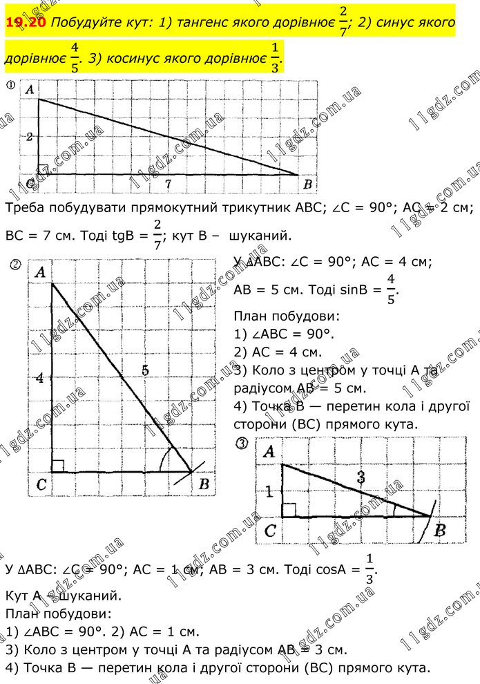 Побудуйте кут: 1) тангенс якого дорівнює 2/7; 2) синус якого дорівнює 4/5. 3) косинус якого дорівнює 1/3. Треба побудувати прямокутний трикутник ABC; ∠C = 90°; AC = 2 см; BC = 7 см. Тоді tgB = 2/7; кут В – шуканий. У ∆ABC: ∠C = 90°; AC = 4 см; AB = 5 см. Тоді sinB = 4/5. План побудови: 1) ∠ABC = 90°. 2) AC = 4 см. 3) Коло з центром у точці А та радіусом AВ = 5 см. 4) Точка В — перетин кола і другої сторони (BC) прямого кута. У ∆ABC: ∠C = 90°; AC = 1 см; AB = 3 см. Тоді cosA = 1/3. Кут А – шуканий. План побудови: 1) ∠ABC = 90°. 2) AC = 1 см. 3) Коло з центром у точці А та радіусом AB = 3 см. 4) Точка В — перетин кола і другої сторони (BC) прямого кута.