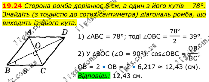 Сторона ромба дорівнює 8 см, а один з його кутів – 78°. Знайдіть (з точністю до сотих сантиметра) діагональ ромба, що виходить із цього кута. 1) ∠АВС = 78°; тоді ∠ОВС = (78°)/2 = 39°. 2) У ∆ВОС (∠О = 90°): cos∠OBC = OB/BC; OB = 2 • OB = 2 • 6,217 ≈ 12,43 (см). Відповідь: 12,43 см.