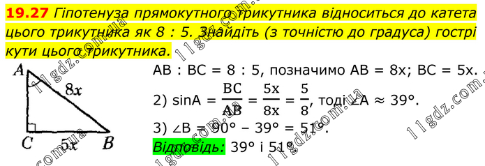 Гіпотенуза прямокутного трикутника відноситься до катета цього трикутника як 8 : 5. Знайдіть (з точністю до градуса) гострі кути цього трикутника. АВ : ВС = 8 : 5, позначимо АВ = 8х; ВС = 5х. 2) sinA = BC/AB = 5x/8x = 5/8, тоді ∠А ≈ 39°. 3) ∠В = 90° – 39° = 51°. Відповідь: 39° і 51°.
