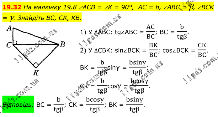 На малюнку 19.8 ∠ACB = ∠K = 90°, AC = b, ∠ABC = β, ∠BCK = γ. Знайдіть BC, CK, KB. 1) У ∆АВС: tg∠ABC = AC/BC; BC = b/tgβ. 2) У ∆CBK: sin∠BCK = BK/BC; cos∠BCK = CK/BC. BK = b/tgβsinγ = bsinγ/tgβ; CK = b/tgβcosγ = bcosγ/tgβ. Відповідь: BC = b/tgβ; CK = bcosγ/tgβ; BK = bsinγ/tgβ.