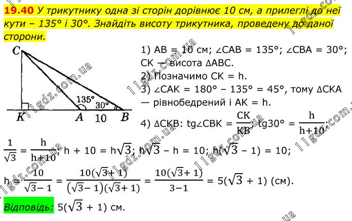 У трикутнику одна зі сторін дорівнює 10 см, а прилеглі до неї кути – 135° і 30°. Знайдіть висоту трикутника, проведену до даної сторони. 1) AB = 10 см; ∠CAB = 135°; ∠CBA = 30°; CK — висота ∆АВС. 2) Позначимо CK = h. 3) ∠CAK = 180° – 135° = 45°, тому ∆CKA — рівнобедрений і AK = h. 4) ∆CKB: tg∠CBK = CK/KB; tg30° = h/(h+10); 1/√3 = h/(h+10); h + 10 = h√3; h√3 – h = 10; h(√3 – 1) = 10; h = 10/(√3- 1) = (10(√3+ 1))/((√3- 1)(√3+ 1)) = (10(√3+ 1))/(3-1) = 5(√3 + 1) (см). Відповідь: 5(√3 + 1) см.