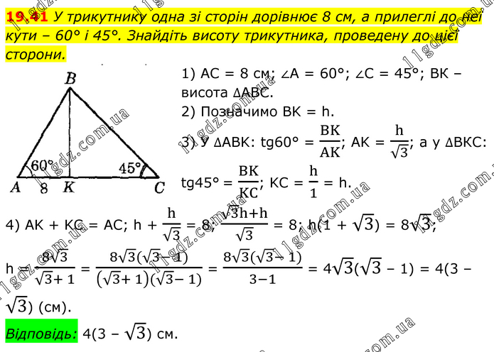 У трикутнику одна зі сторін дорівнює 8 см, а прилеглі до неї кути – 60° і 45°. Знайдіть висоту трикутника, проведену до цієї сторони. 1) AC = 8 см; ∠A = 60°; ∠C = 45°; BК – висота ∆АВС. 2) Позначимо BK = h. 3) У ∆ABK: tg60° = BK/AK; AK = h/√3; а у ∆ВКС: tg45° = BK/KC; KC = h/1 = h. 4) AK + KC = AC; h + h/√3 = 8; (√3 h+h)/√3 = 8; h(1 + √3) = 8√3; h = (8√3)/(√3+ 1) = (8√3(√3- 1))/((√3+ 1)(√3- 1)) = (8√3(√3- 1))/(3-1) = 4√3(√3 – 1) = 4(3 – √3) (см). Відповідь: 4(3 – √3) см.