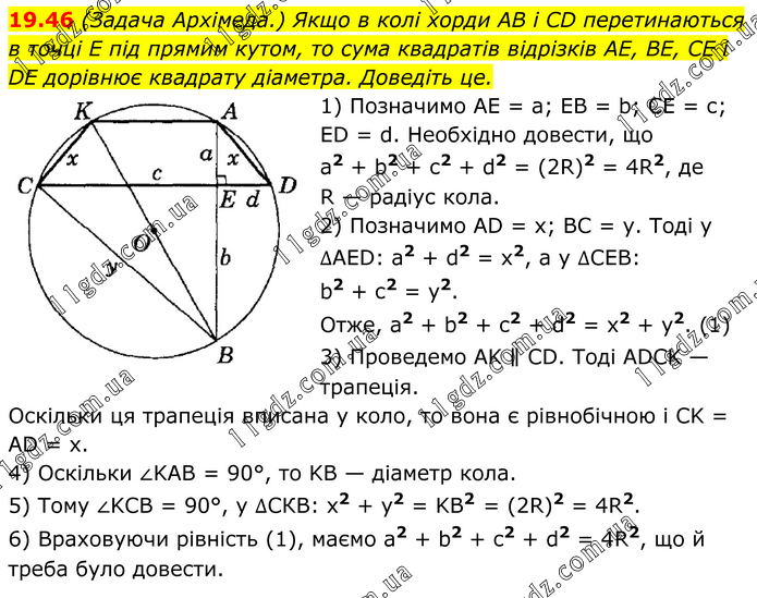(Задача Архімеда.) Якщо в колі хорди AB і CD перетинаються в точці E під прямим кутом, то сума квадратів відрізків AE, BE, CE і DE дорівнює квадрату діаметра. Доведіть це. 1) Позначимо AE = a; EB = b; CE = с; ED = d. Необхідно довести, що а2 + b2 + с2 + d2 = (2R)2 = 4R2, де R — радіус кола. 2) Позначимо AD = x; BC = у. Тоді у ∆AED: а2 + d2 = х2, а у ∆CEB: b2 + с2 = у2. Отже, а2 + b2 + c2 + d2 = x2 + у2. (1) 3) Проведемо AK ∥ CD. Тоді ADCK — трапеція. Оскільки ця трапеція вписана у коло, то вона є рівнобічною і CK = AD = х. 4) Оскільки ∠KAB = 90°, то KB — діаметр кола. 5) Тому ∠KCB = 90°, у ∆СКВ: х2 + у2 = KB2 = (2R)2 = 4R2. 6) Враховуючи рівність (1), маємо а2 + b2 + c2 + d2 = 4R2, що й треба було довести.