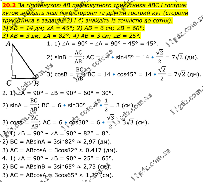 За гіпотенузою AB прямокутного трикутника ABC і гострим кутом знайдіть інші його сторони та другий гострий кут (сторони трикутника в задачах 3) і 4) знайдіть із точністю до сотих). 1) AB = 14 дм; ∠A = 45°; 2) AB = 6 см; ∠B = 60°; 3) AB = 3 дм; ∠A = 82°; 4) AB = 3 см; ∠B = 25°. 1. 1) ∠A = 90° – ∠А = 90° – 45° = 45°. 2) sinВ = АС/АВ; АC = 14 • sin45° = 14 • √2/2 = 7√2 (дм). 3) cosВ = ВС/АВ; ВC = 14 • cos45° = 14 • √2/2 = 7√2 (дм). 2. 1) ∠A = 90° – ∠B = 90° – 60° = 30°. 2) sinA = ВС/АВ; BC = 6 • sin30° = 6 • 1/2 = 3 (см). 3) cosA = АС/АВ; AC = 6 • cos30° = 6 • √3/2 = 3√3 (см). 3. 1) ∠B = 90° – ∠A = 90° – 82° = 8°. 2) BC = ABsinA = 3sin82° ≈ 2,97 (дм). 3) АC = ABcosA = 3cos82° ≈ 0,417 (дм). 4. 1) ∠A = 90° – ∠B = 90° – 25° = 65°. 2) BC = ABsinB = 3sin65° ≈ 2,73 (см). 3) AC = ABcosА = 3сos65° ≈ 1,27 (cм).