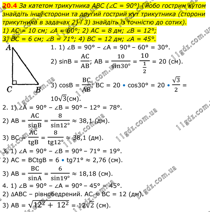 За катетом трикутника ABC (∠C = 90°) і йобо гострим кутом знайдіть інші сторони та другий гострий кут трикутника (сторони трикутника в задачах 2) і 3) знайдіть із точністю до сотих). 1) AC = 10 см; ∠A = 60°; 2) AC = 8 дм; ∠B = 12°; 3) BC = 6 см; ∠B = 71°; 4) BC = 12 дм; ∠A = 45°. 1. 1) ∠В = 90° – ∠А = 90° – 60° = 30°. 2) sinB = AC/AB; AB = 10/(sin30°) = 10/(1/2) = 20 (см). 3) cosB = BC/AB; BC = 20 • cos30° = 20 • √3/2 = 10√3(см). 2. 1) ∠A = 90° – ∠B = 90° – 12° = 78°. 2) AB = AC/sinB = 8/(sin12°) ≈ 38,1 (дм). 3) ВС = АC/tgB = 8/(tg12°) ≈ 38,1 (дм). 3. 1) ∠А = 90° – ∠В = 90° – 71° = 19°. 2) АС = BCtgB = 6 • tg71° ≈ 2,76 (cм). 3) AB = BC/sinA = 6/(sin19°) ≈ 18,18 (cм). 4. 1) ∠B = 90° – ∠A = 90° – 45° = 45°. 2) ∆АВС – рівнобедрений. АС = ВС = 12 (дм). 3) АВ = √(12^2+ 12^2 ) = 12√2 (см).