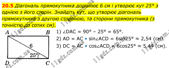 Діагональ прямокутника дорівнює 6 см і утворює кут 25° з однією з його сторін. Знайдіть кут, що утворює діагональ прямокутника з другою стороною, та сторони прямокутника (з точністю до сотих см). 1) ∠DAC = 90° – 25° = 65°. 2) AD = AC • sin∠ACD = 6sin25° ≈ 2,54 (cм). 3) DC = AC • cos∠ACD = 6cos25° ≈ 5,44 (cм).