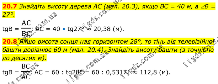 20.7 Знайдіть висоту дерева AC (мал. 20.3), якщо BC = 40 м, а ∠B = 27°. tgB = AC/BC; AC = 40 • tg27° ≈ 20,38 (м). 20.8 Якщо висота сонця над горизонтом 28°, то тінь від телевізійної башти дорівнює 60 м (мал. 20.4). Знайдіть висоту башти (з точністю до десятих м). tgB = ВС/АС; AC = 60 : tg28° = 60 : 0,53171 ≈ 112,8 (м).