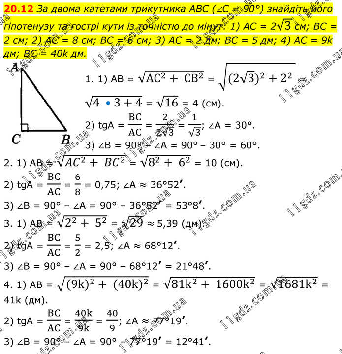 За двома катетами трикутника ABC (∠C = 90°) знайдіть його гіпотенузу та гострі кути із точністю до мінут: 1) AC = 2√3 см; BC = 2 см; 2) AC = 8 см; BC = 6 см; 3) AC = 2 дм; BC = 5 дм; 4) AC = 9k дм; BC = 40k дм. 1. 1) АВ = √(〖АС〗^2+ 〖СВ〗^2 ) = √(〖(2√3 )^2+2〗^2 ) = √(4 •3+4) = √16 = 4 (см). 2) tgA = BC/AC = 2/(2√3) = 1/√3; ∠A = 30°. 3) ∠B = 90° – ∠A = 90° – 30° = 60°. 2. 1) AB = √(〖AC〗^2+ 〖BC〗^2 ) = √(8^2+ 6^2 ) = 10 (cм). 2) tgA = BC/AC = 6/8 = 0,75; ∠A ≈ 36°52’. 3) ∠B = 90° – ∠A = 90° – 36°52’ = 53°8’. 3. 1) AB = √(2^2+ 5^2 ) = √29 ≈ 5,39 (дм). 2) tgA = BC/AC = 5/2 = 2,5; ∠A ≈ 68°12’. 3) ∠B = 90° – ∠A = 90° – 68°12’ = 21°48’. 4. 1) AB = √((9k)^2+ (40k)^2 ) = √(81k^2+ 1600k^2 ) = √(1681k^2 ) = 41k (дм). 2) tgA = BC/AC = 40k/9k = 40/9; ∠A ≈ 77°19’. 3) ∠B = 90° – ∠A = 90° – 77°19’ = 12°41’.