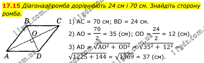 Діагоналі ромба дорівнюють 24 см і 70 см. Знайдіть сторону ромба. 1) AC = 70 см; BD = 24 см. 2) AO = 70/2 = 35 (см); OD = 24/2 = 12 (см). 3) AD = √(〖АО〗^2+ OD^2 ) = √(35^2+ 12^2 ) = √(1225+144) = √1369 = 37 (см).