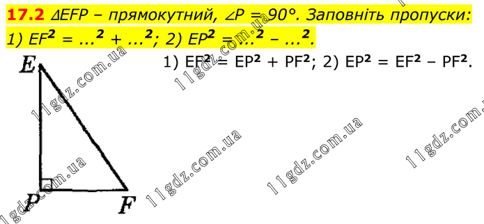 ∆EFP – прямокутний, ∠P = 90°. Заповніть пропуски: 1) EF2 = ...2 + ...2; 2) EP2 = ...2 – ...2. 1) EF2 = EР2 + PF2; 2) EP2 = EF2 – PF2.