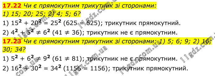 17.22 Чи є прямокутним трикутник зі сторонами: 1) 15; 20; 25; 2) 4; 5; 6? 1) 152 + 202 = 252 (625 = 625); трикутник прямокутний. 2) 42 + 52 ≠ 62 (41 ≠ 36); трикутник не є прямокутним. 17.23 Чи є прямокутним трикутник зі сторонами: 1) 5; 6; 9; 2) 16; 30; 34? 1) 52 + 62 ≠ 92 (61 ≠ 81); трикутник не є прямокутним. 2) 162 + 302 = 342 (1156 = 1156); трикутник прямокутний.