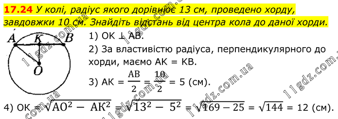 У колі, радіус якого дорівнює 13 см, проведено хорду, завдовжки 10 см. Знайдіть відстань від центра кола до даної хорди. 1) OK ⊥ AB. 2) За властивістю радіуса, перпендикулярного до хорди, маємо AK = KB. 3) АК = АВ/2 = 10/2 = 5 (см). 4) ОК = √(〖АО〗^2- 〖АК〗^2 ) = √(13^2- 5^2 ) = √(169-25) = √144 = 12 (см).