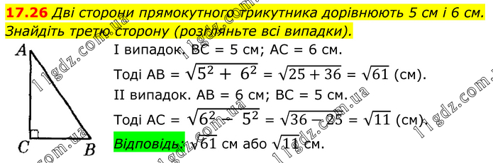 Дві сторони прямокутного трикутника дорівнюють 5 см і 6 см. Знайдіть третю сторону (розгляньте всі випадки). І випадок. ВС = 5 см; АС = 6 см. Тоді АВ = √(5^2+ 6^2 ) = √(25+36) = √61 (см). ІІ випадок. АВ = 6 см; ВС = 5 см. Тоді АС = √(6^2- 5^2 ) = √(36-25) = √11 (см). Відповідь: √61 см або √11 см.