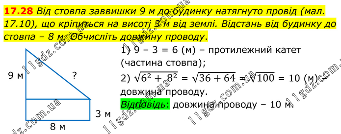 Від стовпа заввишки 9 м до будинку натягнуто провід (мал. 17.10), що кріпиться на висоті 3 м від землі. Відстань від будинку до стовпа – 8 м. Обчисліть довжину проводу. 1) 9 – 3 = 6 (м) – протилежний катет (частина стовпа); 2) √(6^2+ 8^2 ) = √(36+64) = √100 = 10 (м) – довжина проводу. Відповідь: довжина проводу – 10 м.