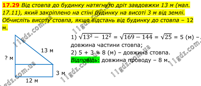 Від стовпа до будинку натягнуто дріт завдовжки 13 м (мал. 17.11), який закріплено на стіні будинку на висоті 3 м від землі. Обчисліть висоту стовпа, якщо відстань від будинку до стовпа – 12 м. 1) √(13^2- 12^2 ) = √(169-144) = √25 = 5 (м) – довжина частини стовпа; 2) 5 + 3 = 8 (м) – довжина стовпа. Відповідь: довжина проводу – 8 м.