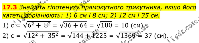 Знайдіть гіпотенузу прямокутного трикутника, якщо його катети дорівнюють: 1) 6 см і 8 см; 2) 12 см і 35 см. 1) с = √(6^2+ 8^2 ) = √(36+64) = √100 = 10 (см). 2) с = √(12^2+ 35^2 ) = √(144+1225) = √1369 = 37 (см).
