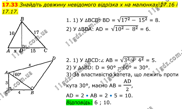 Знайдіть довжину невідомого відрізка x на малюнках 17.16 і 17.17. 1. 1) У ∆BCD: BD = √(17^2- 15^2 ) = 8. 2) У ∆BDA: AD = √(10^2- 8^2 ) = 6. 2. 1) У ∆BCD:∠ AB = √(3^2+ 4^2 ) = 5. 2) У ∆ABD: D = 90° – 60° = 30°. 3) За властивістю катета, що лежить проти кута 30°, маємо AB = AD/2, AD = 2 • AB = 2 • 5 = 10. Відповідь: 6 ; 10.