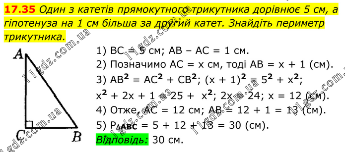 Один з катетів прямокутного трикутника дорівнює 5 см, а гіпотенуза на 1 см більша за другий катет. Знайдіть периметр трикутника. 1) BC = 5 см; AB – AC = 1 см. 2) Позначимо AC = х см, тоді AB = х + 1 (см). 3) AB2 = AC2 + CB2; (х + 1)2 = 52 + x2; x2 + 2х + 1 = 25 + x2; 2х = 24; x = 12 (см). 4) Отже, AC = 12 см; AB = 12 + 1 = 13 (см). 5) P∆ABC = 5 + 12 + 13 = 30 (см). Відповідь: 30 см.
