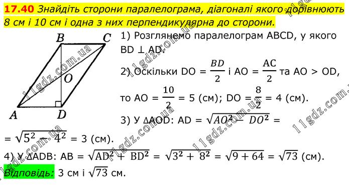 Знайдіть сторони паралелограма, діагоналі якого дорівнюють 8 см і 10 см і одна з них перпендикулярна до сторони. 1) Розглянемо паралелограм ABCD, у якого BD ⊥ AD. 2) Оскільки DO = BD/2 і AO = AC/2 та AO > OD, то AO = 10/2 = 5 (см); DO = 8/2 = 4 (см). 3) У ∆AOD: AD = √(〖AO〗^2- 〖DO〗^2 ) = = √(5^2- 4^2 ) = 3 (см). 4) У ∆ADB: AB = √(AD^2+ BD^2 ) = √(3^2+ 8^2 ) = √(9+64) = √73 (cм). Відповідь: 3 см і √73 см.