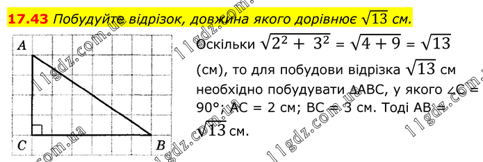Побудуйте відрізок, довжина якого дорівнює √13 см. Оскільки √(2^2+ 3^2 ) = √(4+9) = √13 (см), то для побудови відрізка √13 см необхідно побудувати ∆ABC, у якого ∠C = 90°; AC = 2 см; BC = 3 см. Тоді AB = √13 см.