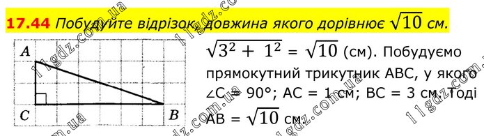 Побудуйте відрізок, довжина якого дорівнює √10 см. √(3^2+ 1^2 ) = √10 (см). Побудуємо прямокутний трикутник ABC, у якого ∠C = 90°; AC = 1 см; BC = 3 см. Тоді AB = √10 см.