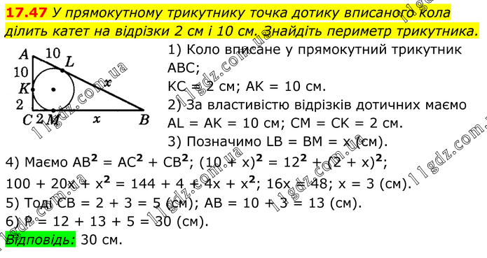 У прямокутному трикутнику точка дотику вписаного кола ділить катет на відрізки 2 см і 10 см. Знайдіть периметр трикутника. 1) Коло вписане у прямокутний трикутник ABC; KC = 2 см; AK = 10 см. 2) За властивістю відрізків дотичних маємо AL = AK = 10 см; CM = CK = 2 см. 3) Позначимо LB = BM = х (см). 4) Маємо AB2 = AC2 + CB2; (10 + х)2 = 122 + (2 + х)2; 100 + 20х + х2 = 144 + 4 + 4х + х2; 16х = 48; х = 3 (см). 5) Тоді CB = 2 + 3 = 5 (см); АВ = 10 + 3 = 13 (см). 6) P = 12 + 13 + 5 = 30 (см). Відповідь: 30 см.