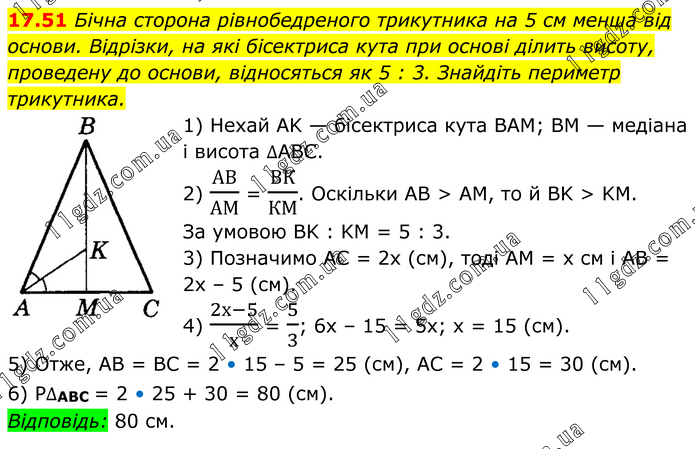 Бічна сторона рівнобедреного трикутника на 5 см менша від основи. Відрізки, на які бісектриса кута при основі ділить висоту, проведену до основи, відносяться як 5 : 3. Знайдіть периметр трикутника. 1) Нехай AK — бісектриса кута ВАМ; BM — медіана і висота ∆АВС. 2) АВ/АМ = ВК/КМ. Оскільки AB > AM, то й BK > KM. За умовою BK : KM = 5 : 3. 3) Позначимо AC = 2х (см), тоді AM = х см і AB = 2х – 5 (см). 4) (2х-5)/х = 5/3; 6х – 15 = 5х; х = 15 (см). 5) Отже, AB = BC = 2 • 15 – 5 = 25 (см), AC = 2 • 15 = 30 (см). 6) P∆АВС = 2 • 25 + 30 = 80 (см). Відповідь: 80 см.