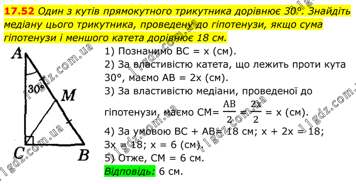 Один з кутів прямокутного трикутника дорівнює 30°. Знайдіть медіану цього трикутника, проведену до гіпотенузи, якщо сума гіпотенузи і меншого катета дорівнює 18 см. 1) Позначимо BC = х (см). 2) За властивістю катета, що лежить проти кута 30°, маємо AB = 2х (см). 3) За властивістю медіани, проведеної до гіпотенузи, маємо CM= АВ/2 = 2х/2 = х (см). 4) За умовою BC + AB= 18 см; х + 2х = 18; Зх = 18; х = 6 (см). 5) Отже, CM = 6 см. Відповідь: 6 см.