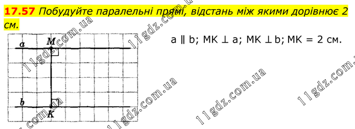 Побудуйте паралельні прямі, відстань між якими дорівнює 2 см. a ∥ b; MK ⊥ a; MK ⊥ b; MK = 2 см.