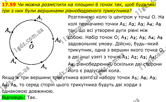 Чи можна розмістити на площині 6 точок так, щоб будь–які три з них були вершинами рівнобедреного трикутника? Розглянемо коло із центром у точці О. На колі позначимо точки A1; A2; A3; A4; A5 так, що всі утворені дуги рівні між собою. Набір точок О; A1; A2; A3; A4; A5 задовольняє умову. Дійсно, будь–який трикутник, одна з вершин якого точка О, а дві інші узяті з точок A1; A2; A3; A4; A5, рівнобедрений, оскільки дві сторони його є радіусами кола. Якщо ж три вершини трикутника взято із набору точок A1; A0; A3; A4; A5, то серед сторін цього трикутника будуть дві хорди з однаковою довжиною. Відповідь: Так.